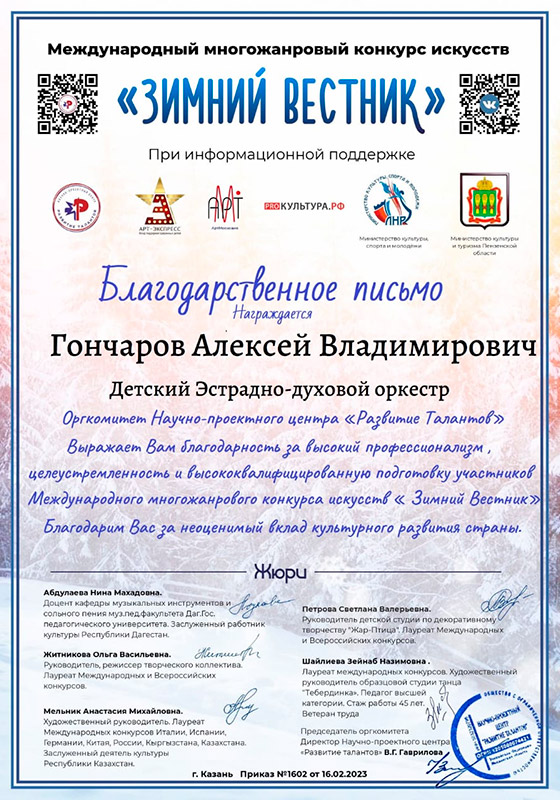 - звание лауреата 1-й степени в межрайонном конкурсе духовых эстрадных оркестров.