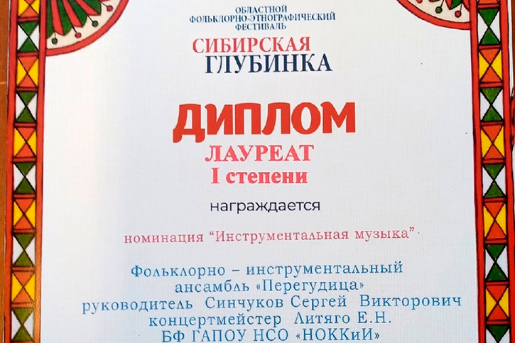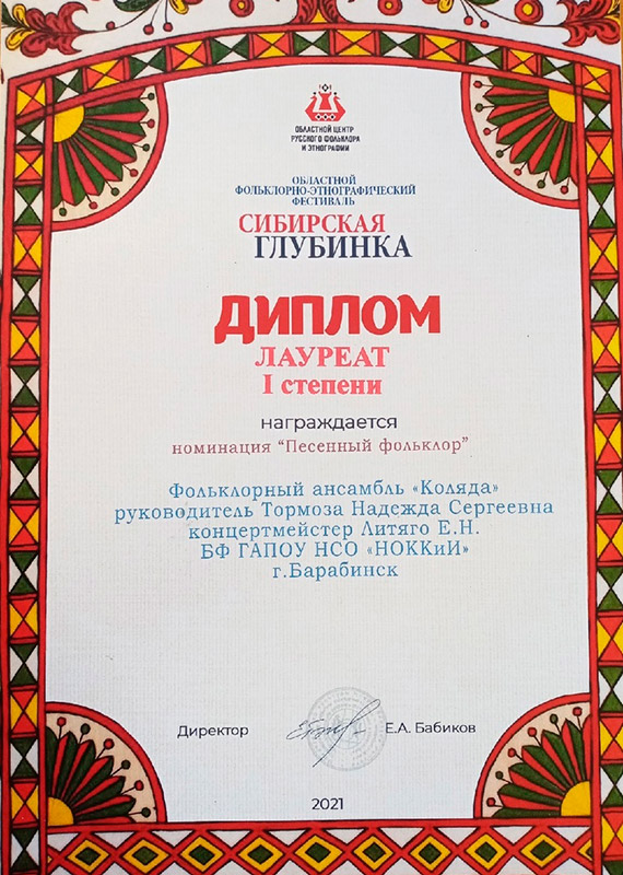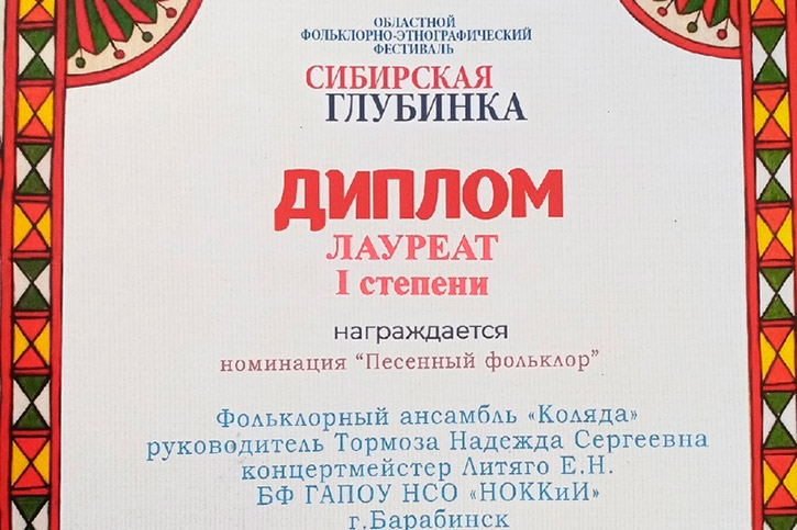 Поздравляем всех участников фестиваля и участников Барабинского филиала ГАПОУ НСО "НОККиИ" - фольклорный ансамбль "Коляда", руководитель Н.С.Тормоза, концертмейстер Е.Н.Литяго и фольклорно-инструментальный ансамбль "Перегудица", руководитель Синчуков С.В., концертмейстер Е.Н.Литяго с дипломом Лауреата I степени.