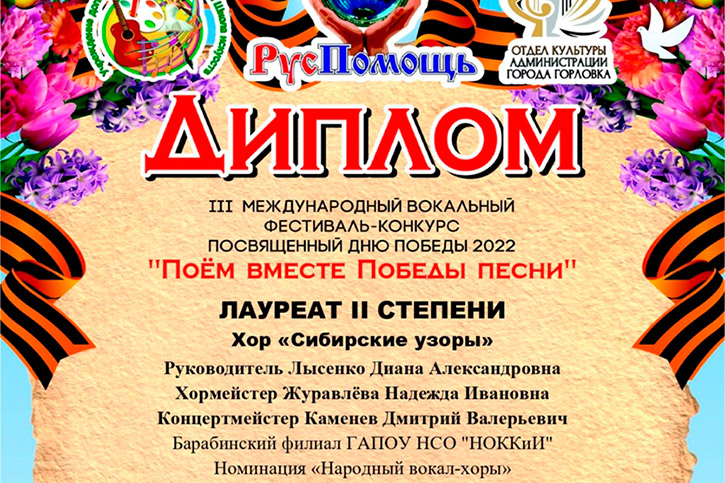 Подведены итоги III Международного вокального фестиваля-конкурса посвящённого Дню Победы 2022 "ПОËМ ВМЕСТЕ ПОБЕДЫ ПЕСНИ". Народный Хор Барабинского филиала "Сибирские узоры" исполнил произведение "Катюша" (музыка М.Блантера, слова М.Исаковского, аранжировка И.Черновского) и стал лауреатом II степени среди 483-х участников. Благодарим организаторов конкурса за высокую оценку.