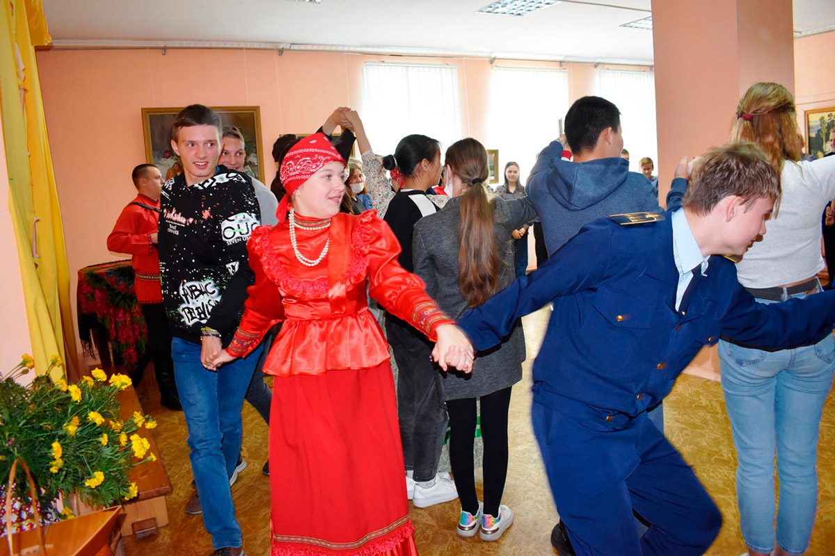 Сотрудники музея в русских народных костюмах встретили гостей традиционным приветствием: "Добрый день и поклон вам, красны девицы да добры молодцы! Гости желанные и дорогие!" и рассказали об истории происхождения этого праздника.