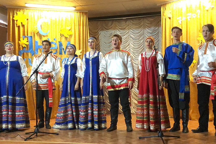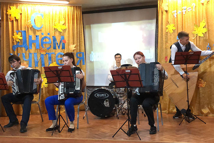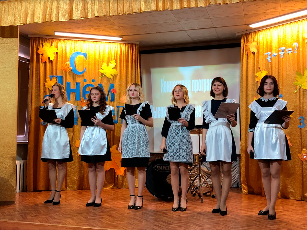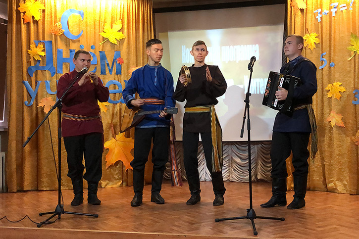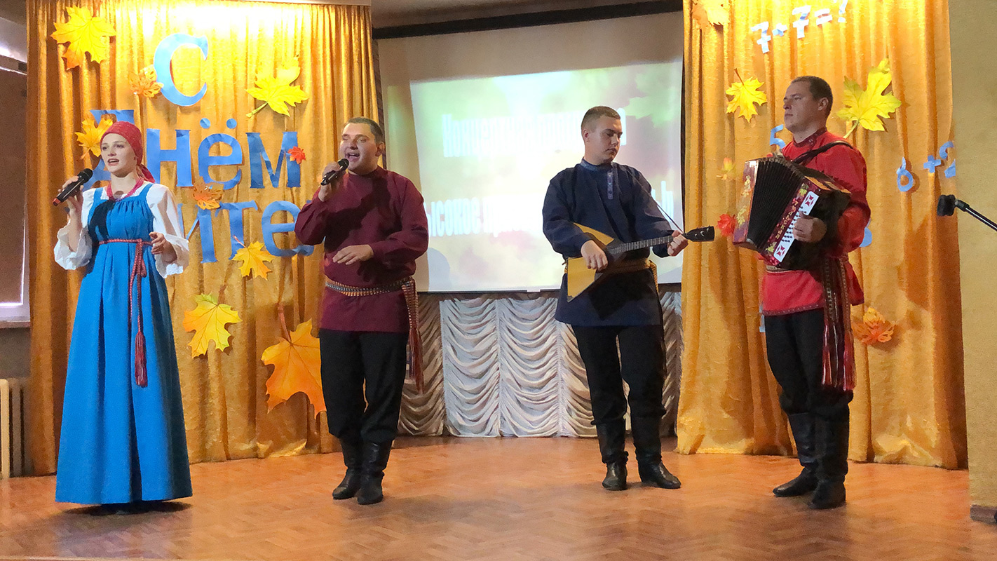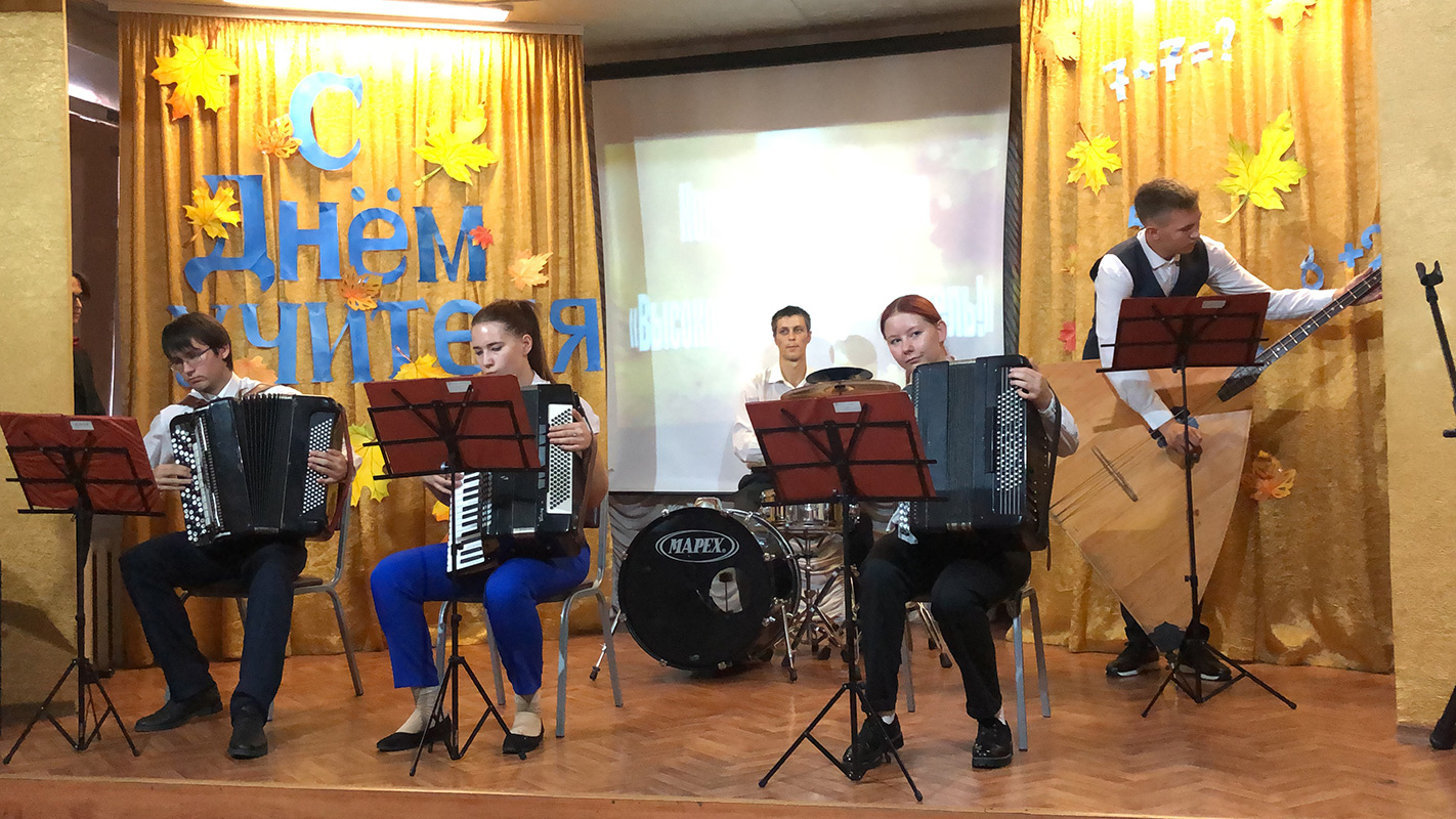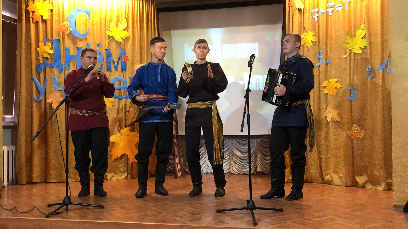 В актовом зале собрался педагогический коллектив, преподаватели, которые уже не первый год работают в колледже, а также молодые специалисты, только начинающие свой путь на поприще просвещения. Поддержать своих любимых преподавателей, выступление творческих коллективов пришли и благодарные студенты всех специальностей, скромно занявшие места на "камчатке". Но скромность сменялась бурными овациями. Студенты посвятили стихотворения, песни любимым преподавателям. Было сказано много хороших слов о представителях учительской профессии. Глядя на счастливые лица зрителей после окончания концерта, было очевидно, что такой подарок пришелся по вкусу преподавателям! В концертной программе принимали участие молодые преподаватели колледжа, творческие коллективы - вокальный ансамбль "Узорень", рук. Сотников С.Е., фольклорный ансамбль "Тереха", рук. Тормоза Н.С., фольклорно-инструментальный ансамбль "Перегудица", рук. Синчуков С.В., народно-инструментальный ансамбль "Суматоха", рук. Шевченко А.А., вокальный ансамбль "Вольница", рук. Шадура Н.Р., солисты - Геншафт О., Кондакова Л., Гусева Л., Богаченко У., студ. 3 курса СиХНП, Николаев А. , студ. 1 курса СКД, оригинальным номером поздравили студенты специальности СКД, Студенческий Совет подготовил видео - поздравление от студентов колледжа.