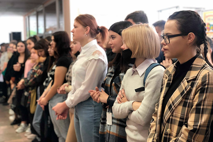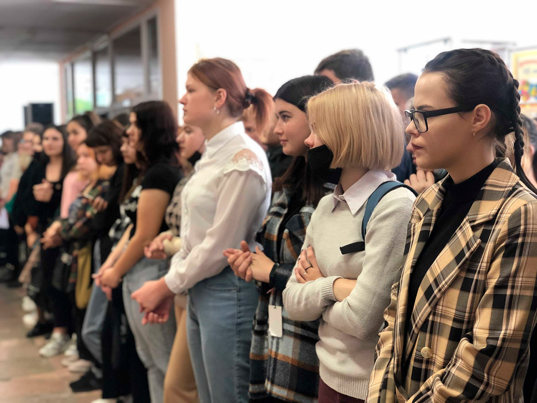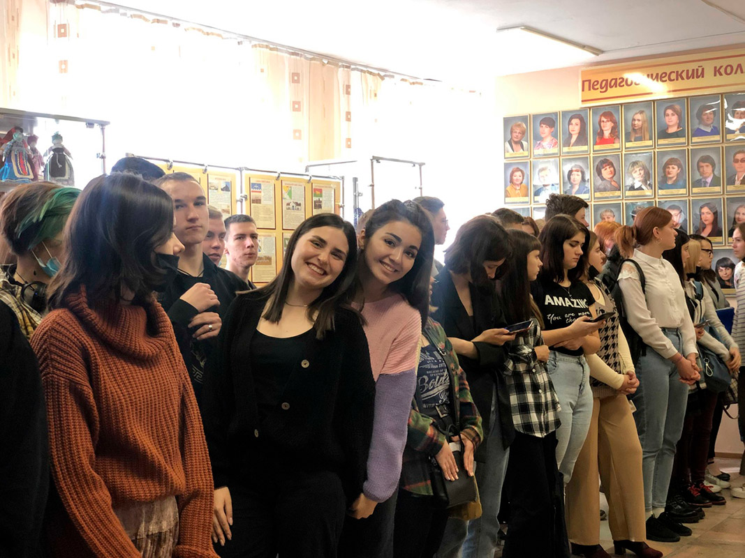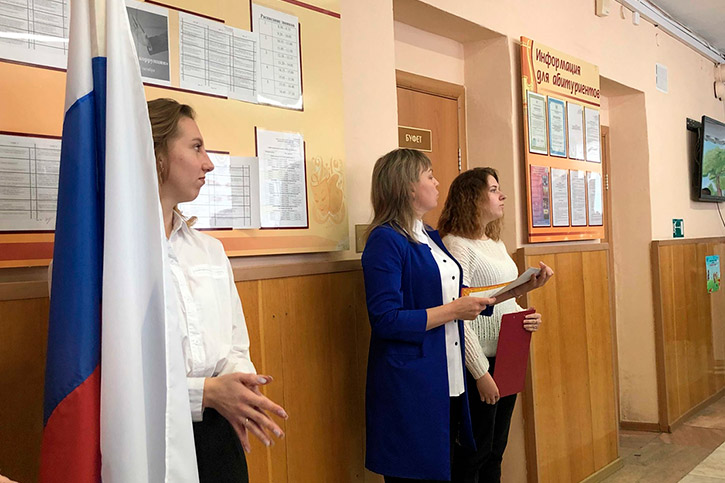 В один из понедельников октября право поднять флаг было предоставлено представителям студенческого самоуправления колледжа: председателю СтудСовета - Марии Костенко, студ. 3 курса ДПИиНП, заместителю председателя СтудСовета – Пуховой Яне, студ 3 курса СКД и председателю СтудСовета общежития-Лагачевой Юлии, студ. 3 курса СКД. Поднятие флага сопровождалось гимном Российской Федерации, который после оглашения знаменательных событий дружно исполняли студенты всего колледжа. Преподаватель истории и обществознания Берш И.А. поздравила всех с началом новой учебной недели, пожелала студентам и преподавателям успехов и хороших оценок.