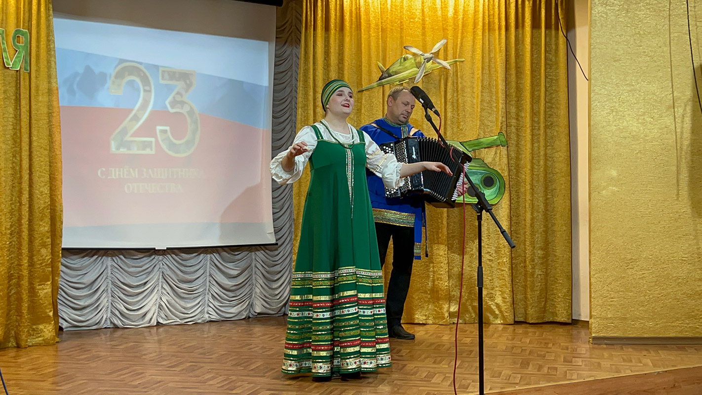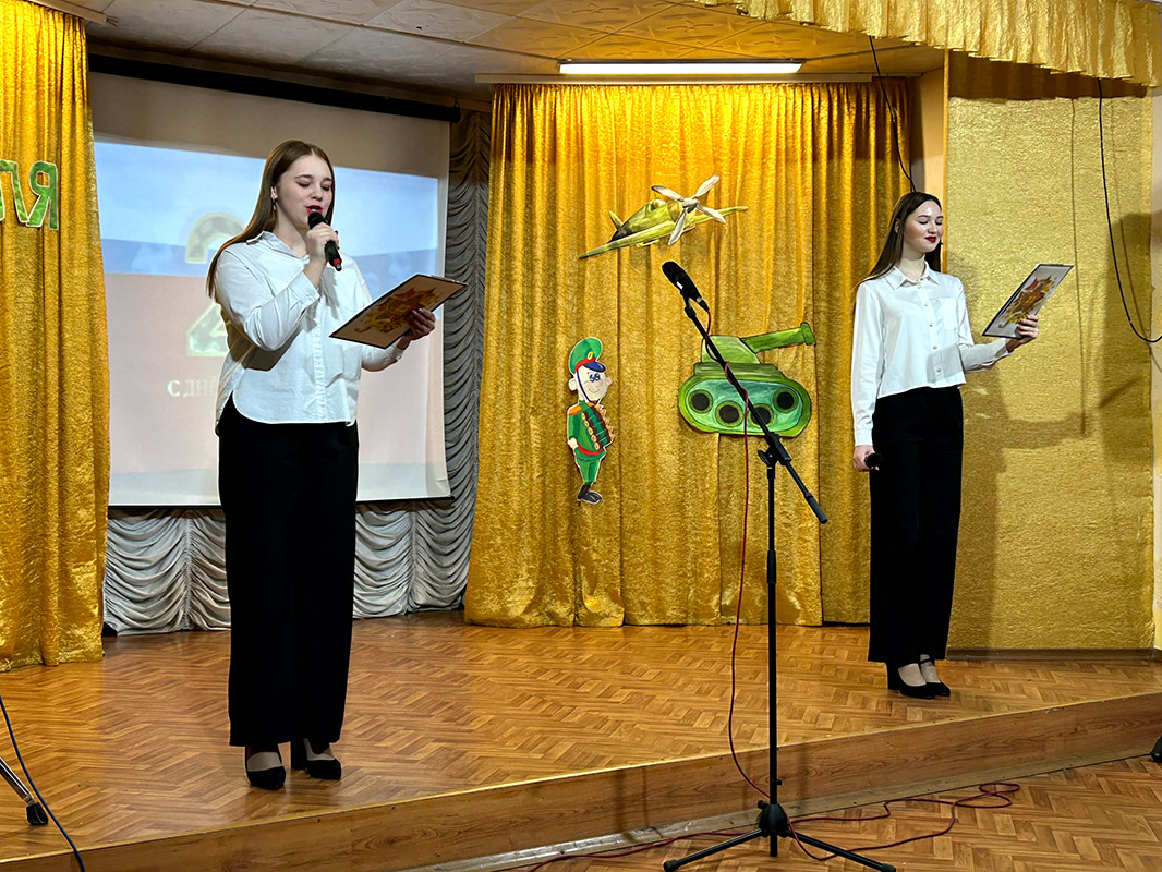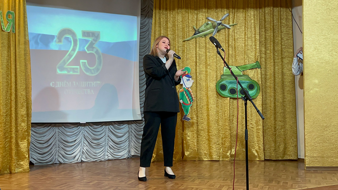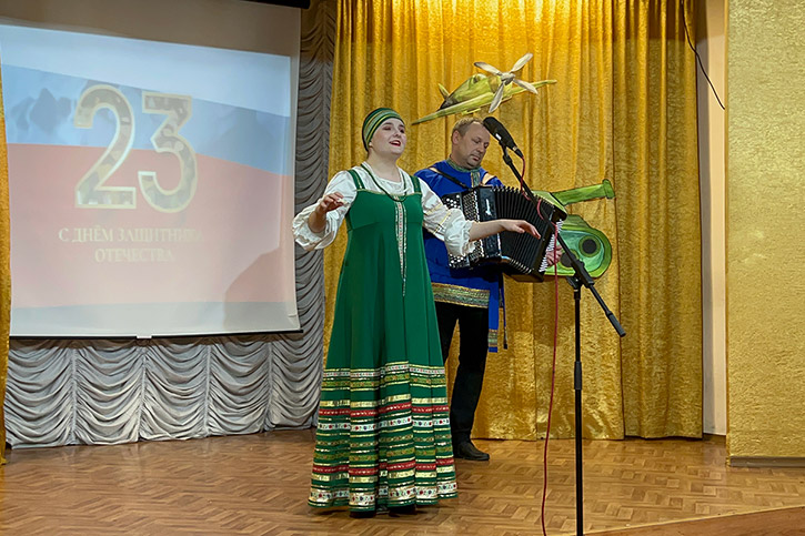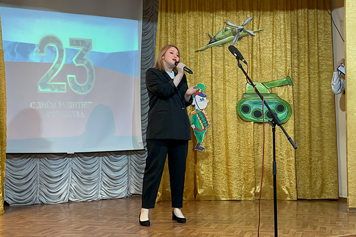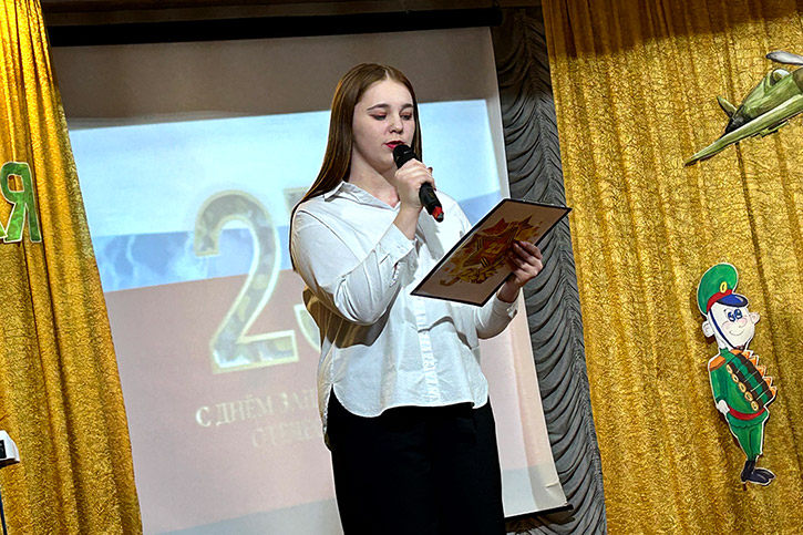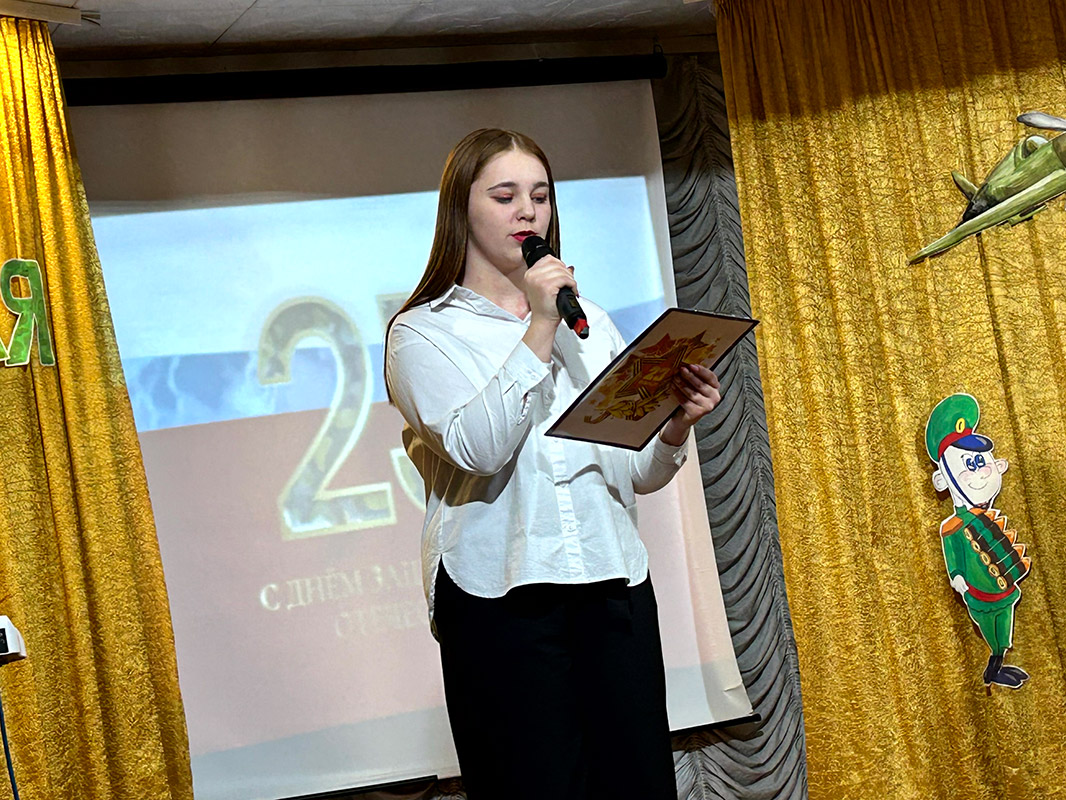 В официальной части концерта с поздравительной речью выступила заведующая филиалом Калабугина М.Г. "Нет на свете выше долга, чем защищать свою родину, свой дом, свою семью, поэтому праздник День защитника Отечества очень любим и почитаем. В этот день мы отдаём дань глубокого уважения и признательности всем поколениям защитников Отечества, чествуем тех, кто защищал нашу родину в годы войны, охранял её в мирное время, и кто сегодня дал присягу и готов в любой момент встать на защиту безопасности нашего государства. Это праздник настоящих мужчин — смелых и отважных, ловких и надёжных, а также праздник мальчиков, которые вырастут и станут защитниками Отечества!".