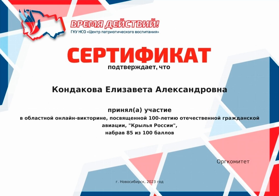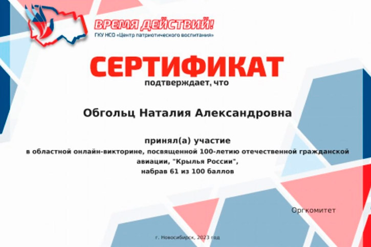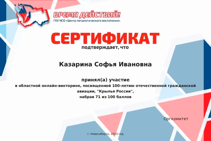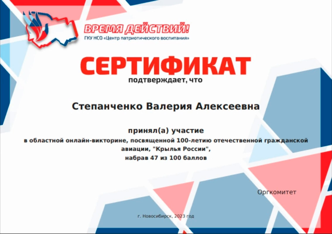 Студенты Барабинского филиала приняли участие в онлайн-викторине "Крылья России" с 10 по 25 марта 2023 года в Новосибирской области на платформе "Знаю Россию"