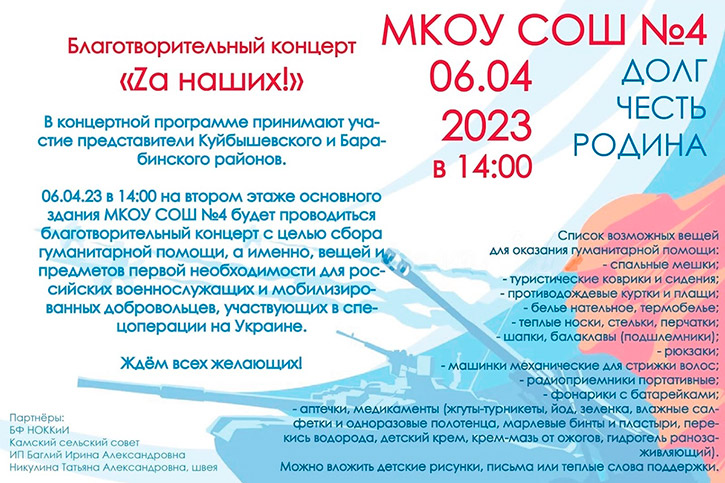 6 апреля 2023 на площадке МКОУ СОШ г.Куйбышева состоялся благотворительный концерт "Za наших!", где приняли участия студенты Барабинского филиала "НОККиИ":
