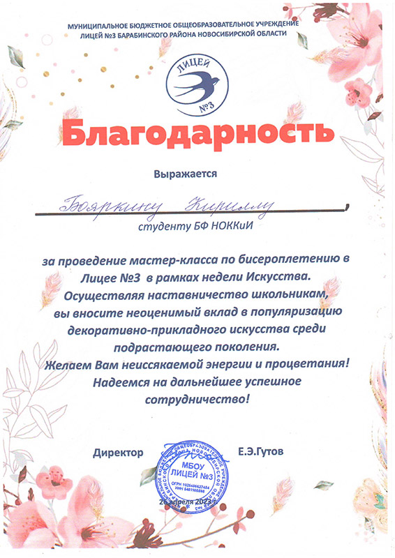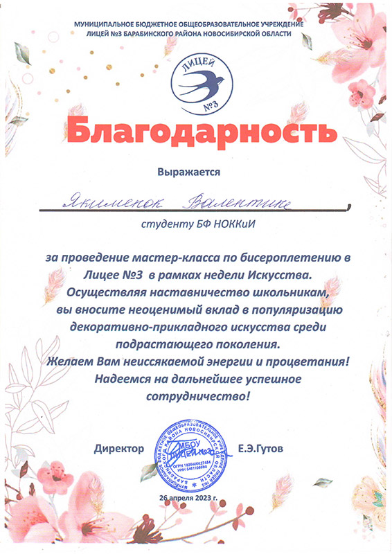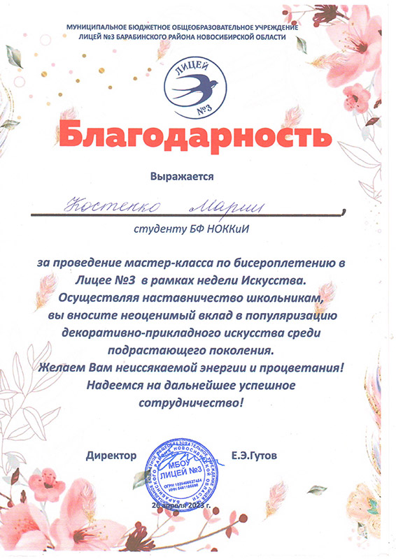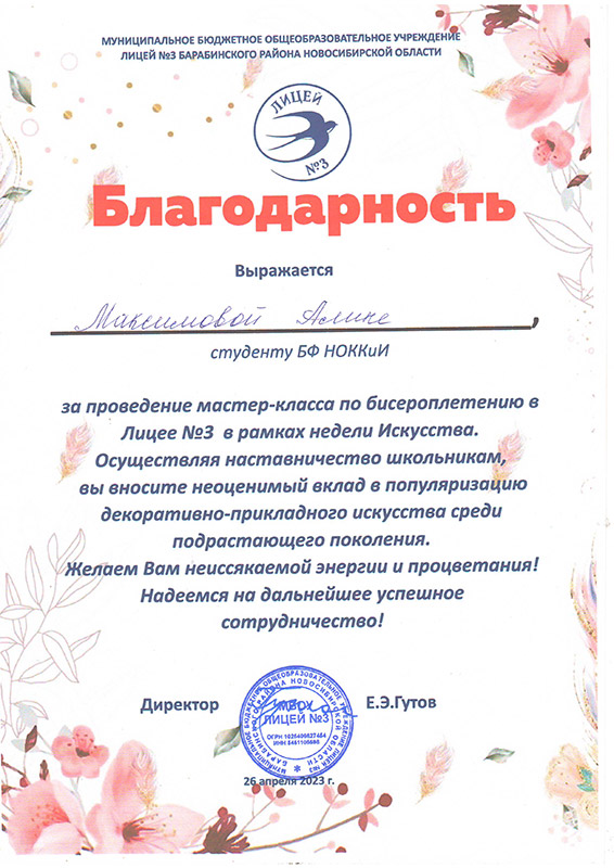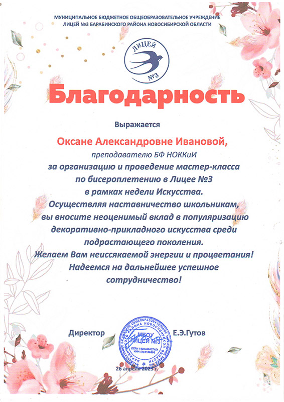 Лицей №3 города Барабинска выражает слова благодарности Марине Геннадьевне Калабугиной, заведующей Барабинским филиалом НОККиИ и Светлане Петровне Трубициной, заведующей ПЦК специальности "Декоративно-прикладное искусство и народные промыслы" за плодотворное сотрудничество в проведении мероприятий в рамках "Недели искусства" и реализации модели наставничества.