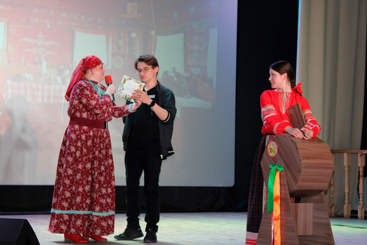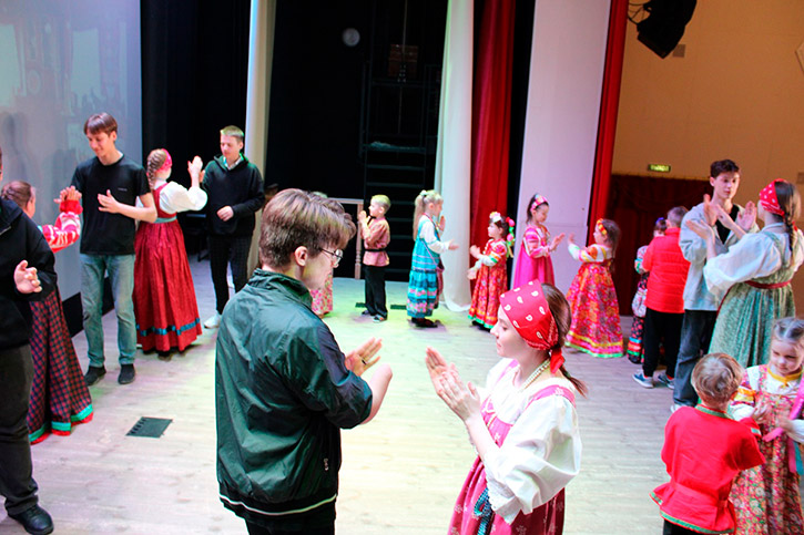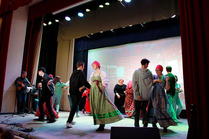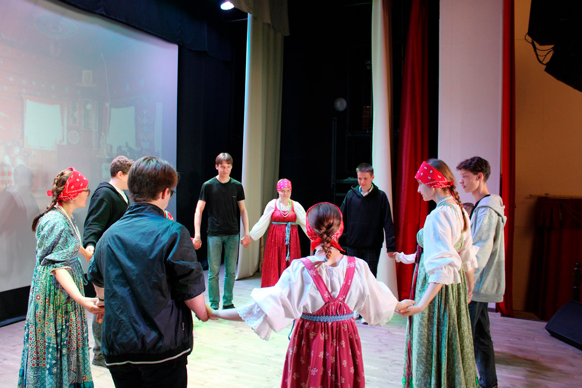 Руководитель образцового ансамбля народной песни "Ладушка" "Культурно-досуговый центр" Куйбышевского района - Замашистая Т.В., и студенты-практиканты 39 группы специальности "Народное художественное творчество" (рук. Тормоза Н.С.) и 21 группы специальности "Сольное и хоровое народное пение" пригласили на семейную вечёрку всех желающих и позволили прикоснуться к русской народной культуре. В фойе встречу гостей украсила веселая матрёшка и гармонист. В этот вечер все гости стали участниками беспроигрышной лотереи. Все собравшиеся в зале весело поиграли в народные игры: "Золотые ворота", "Дударь", и, конечно, приняли участие в танцах "Подгорная", "Во саду ли в огороде".