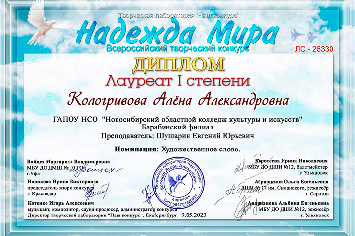 Кологривова Алёна студентка специальности "Социально-культурная деятельность" приняла участие во Всероссийском творческом конкурсе "Надежда Мира" направленного на развитие творческого потенциала участников творческих объединений, клубных формирований, образовательных учреждений.