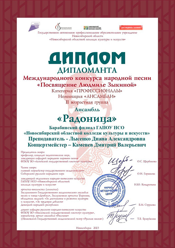 Ансамбль "Радоница" (руководитель - Лысенко Диана Александровна, концертмейстер - Каменев Дмитрий Валерьевич) - дипломанты;