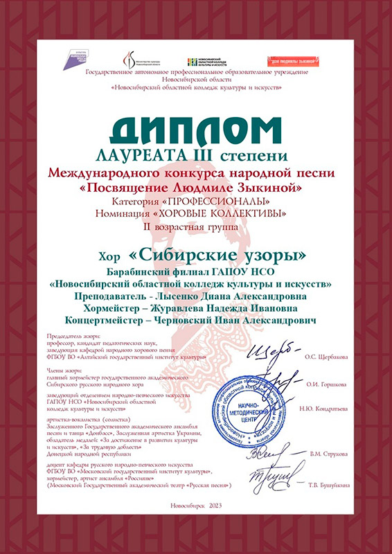 Хор "Сибирские узоры" (руководитель - Лысенко Диана Александровна, хормейстер - Журавлева Надежда Ивановна, концертмейстер - Черновский Иван Александрович) - лауреаты III степени;