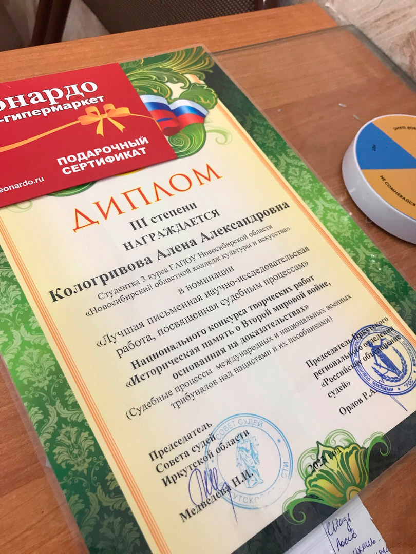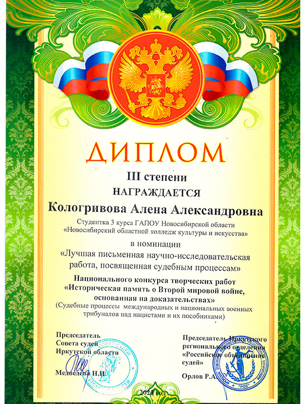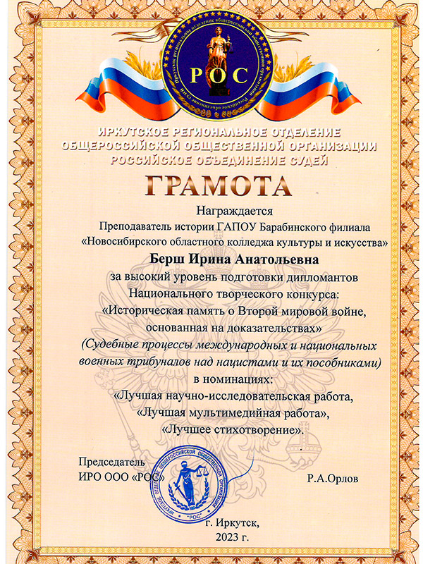Студенты колледжа приняли участие в национальном творческом конкурсе Российского объединения судей "Историческая память о Второй мировой войне", основанная на доказательствах", под руководством преподавателя истории и обществознания Барабинского филиала ГАПОУ НСО Берш И.А.