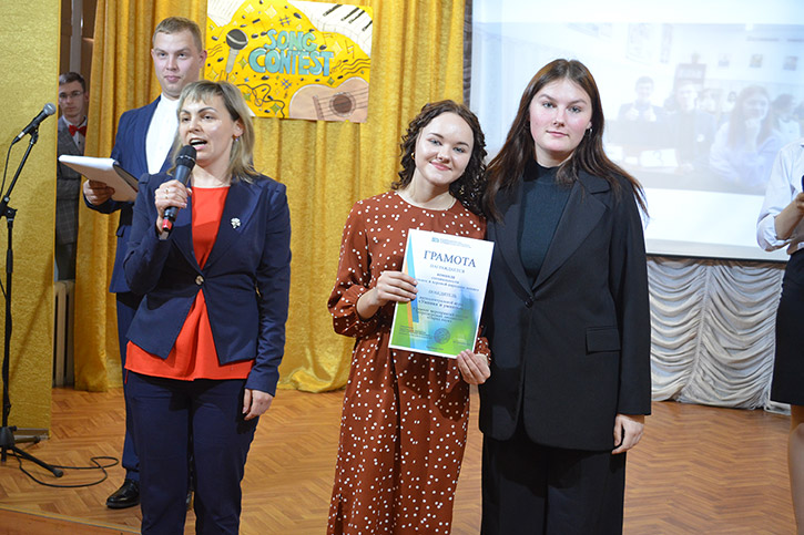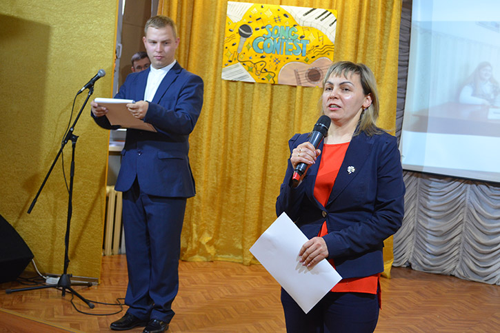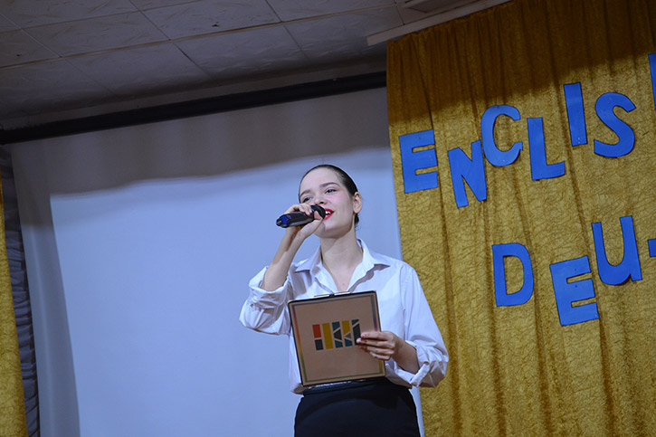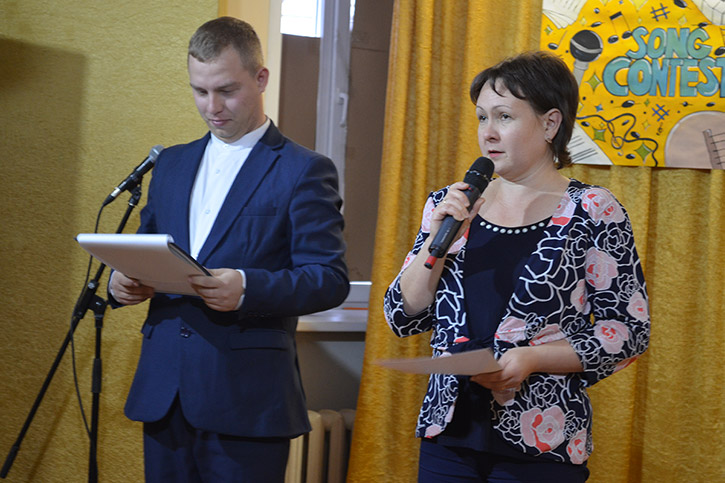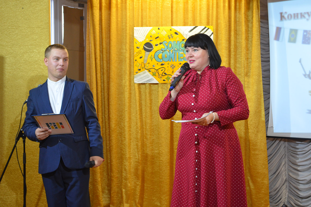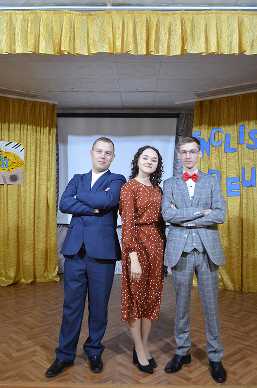 Ведущими конкурса были студенты 2 курса специальности СКД Николаев Артем и Полина Орёл. Они приветствовали конкурсантов на английском и русском языках, провели шуточные игры со зрителями "Instruments in English", "Guess the song!"