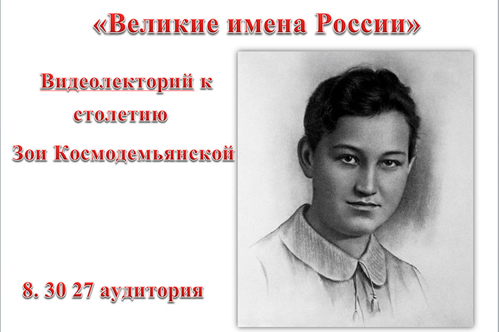 В 2023 году исполняется 100 лет со дня рождения Зои Космодемьянской. История первой женщины-героя Советского Союза в годы Великой Отечественной войны облетела весь мир. Во вторник преподаватель истории Берш И.А. провела со студентами видеолекторий о подвиге Зои Космодемьянской, так как в год 100-летия со дня её рождения, важно вспомнить о человеке, ставшем символом антифашистской борьбы, несгибаемости советских людей, показавшем небывалую волю к победе, нежелание сдаваться и подчиняться врагу.