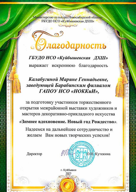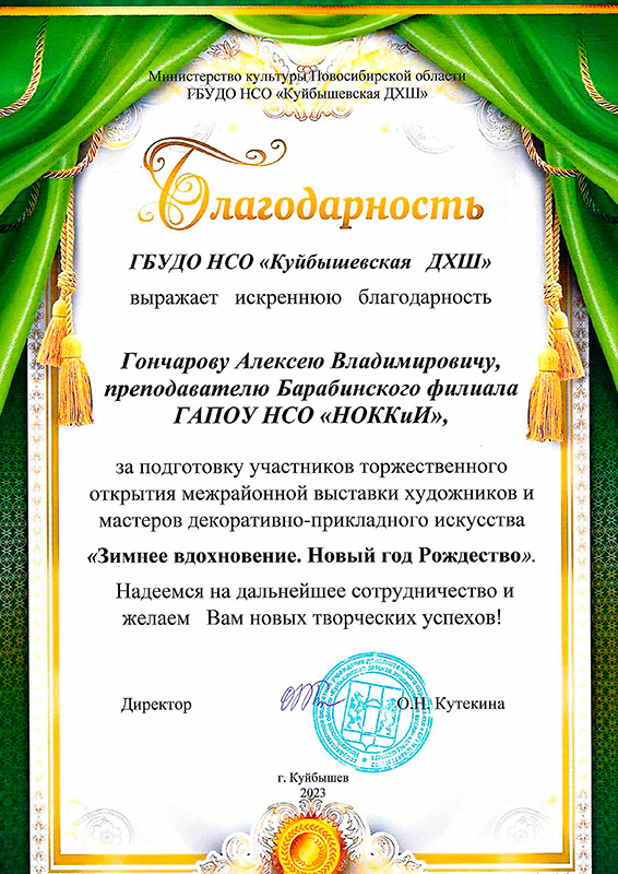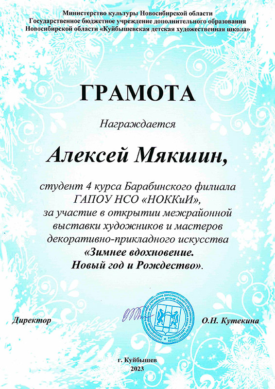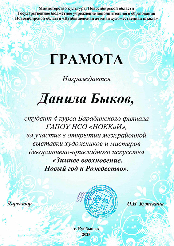 Студенты специальности "Педагогика дополнительного образования" Алексей Мякшин и Данила Быков, преподаватель специальности "Народное художественное творчество" Литяго Е.Н. стали участниками открытия традиционной межрайонная выставка мастеров декоративно-прикладного творчества "Зимнее вдохновение. Новый год и Рождество" в Детской художественной школе Куйбышевского района.
