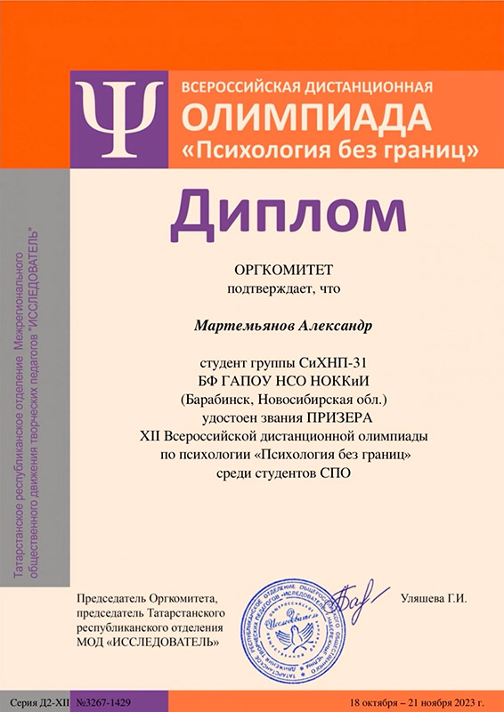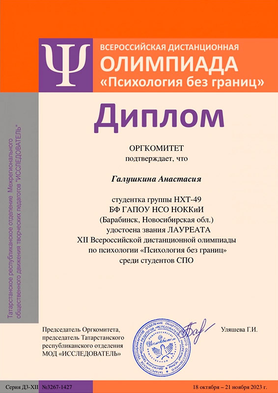 Студенты Барабинского филиала НОККиИ приняли участие в XII Всероссийской олимпиаде по психологии "Психология без границ" среди команд СПО, организованной Татарстанским республиканским отделением Межрегионального общественного движения творческих педагогов "Исследователь".