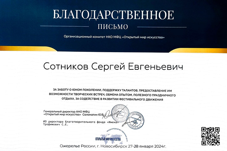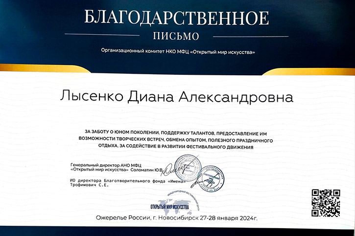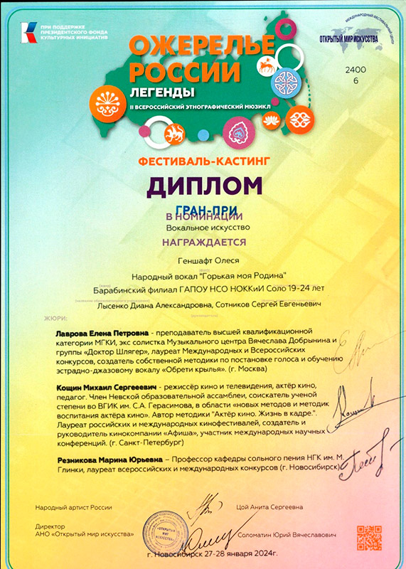 В г.Новосибирске 27-28 января 2024 года состоялись прослушивания в рамках фестиваля-кастинга "Ожерелье России" при поддержке Президентского фонда культурных инициатив. Геншафт Олеся, студентка БФ ГАПОУ НСО "НОККиИ", стала обладателем ГРАН-ПРИ в номинации вокальное искусство (народный вокал).
