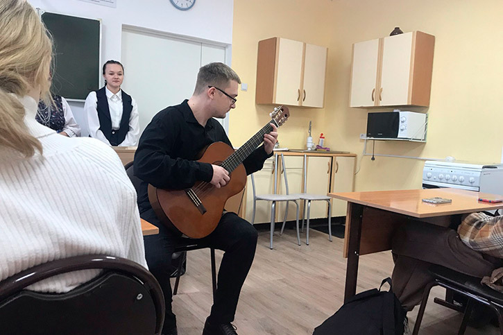 Молодые таланты подарили возможность школьникам - и учителям насладиться музыкой. Галушкина А. НХТ-49, руководитель Синчуков С.В. и Тормоза Н.С., Шикеря К., ПДО-34, руководитель Гончаров А.В., Петрищева К. СиХНП-21, Борушевская С.А. подготовили концертные номера и продемонстрировали свое владение искусством игры на гитаре, гуслях и свирели. Гармоничный голос и мастерство игры на инструментах показала Галушкина А., великолепное исполнение солистки колледжа Петрищевой К.