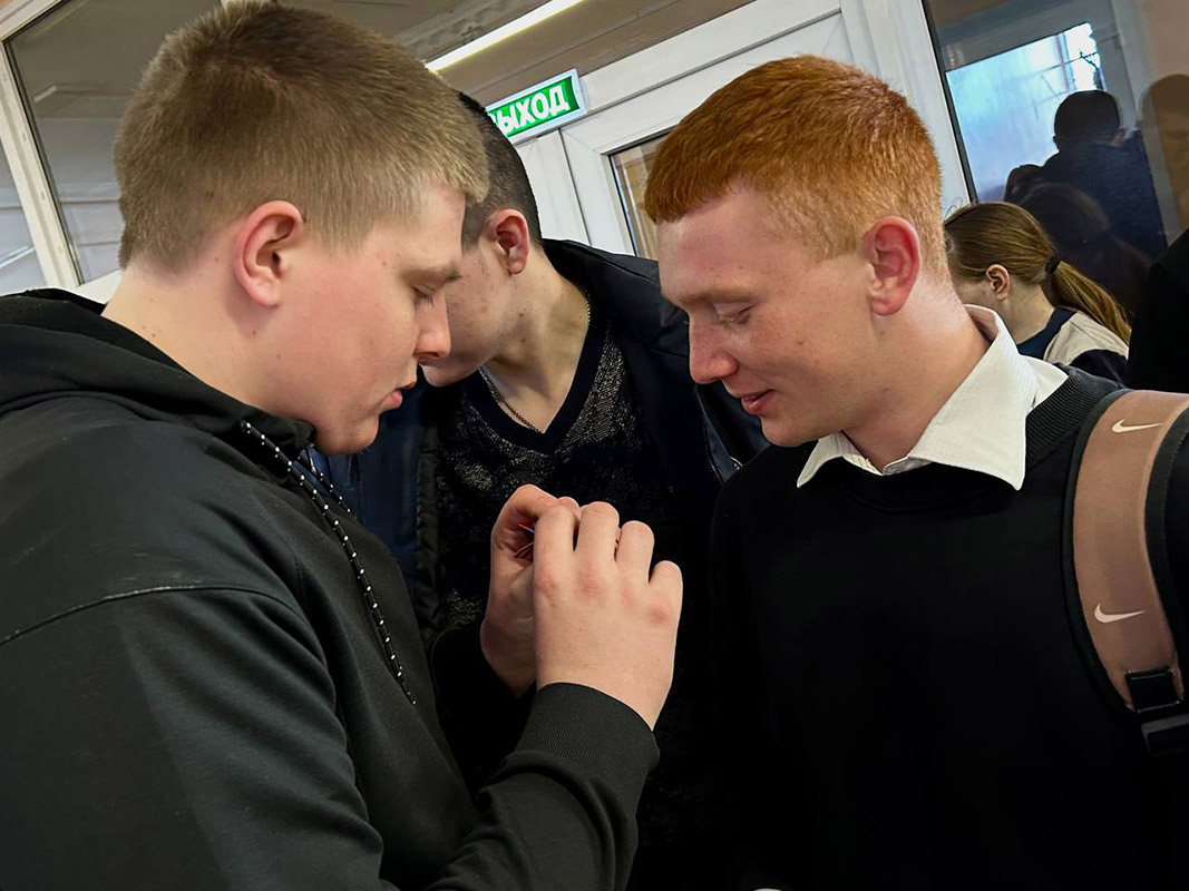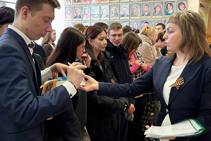 Во время торжественной линейки преподаватель истории И.А.Берш раздала студентам и преподавателям ленты, объяснив значение и правила закрепления символа на одежде - с левой стороны, ближе к сердцу.