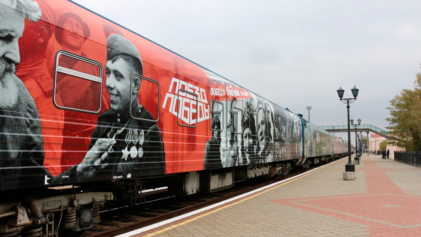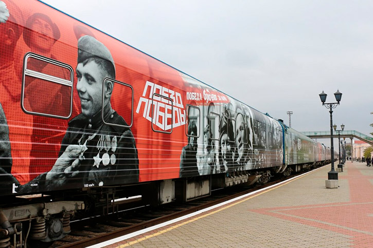 "Поезд Победы" - это первая в мире иммерсивная инсталляция, размещенная в движущемся поезде. В основе - история о Великой Отечественной войне, рассказанная от лица ветерана-железнодорожника. Экспозиция была создана в 2020 году в рамках Года Памяти и Славы, она включает уникальные скульптуры и мультимедийное сопровождение: 50 видеопроекторов, 18 видеостен, 12 тач-столов, которые благодаря световым и звуковым эффектам воссоздают эпизоды воздушных боев и танковых сражений, походной жизни солдат и мирных воспоминаний довоенного времени. Впервые в Новосибирскую область "Поезд Победы" приезжал в 2021 году.