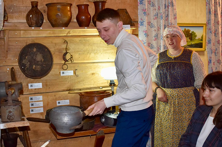 Экскурсовод познакомила ребят с русскими народными традициями бытования, воспитания детей, особенностями семейного уклада в крестьянских семьях.