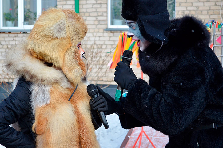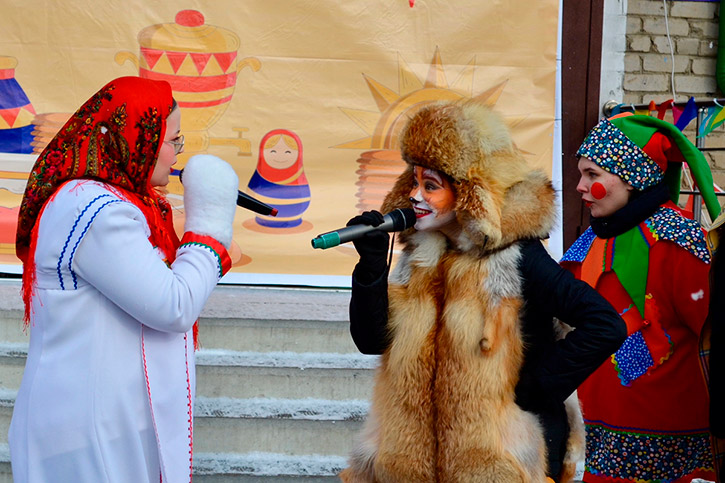 Артисты подготовили для школьников настоящее театрализованное представление, главными героями которого стали озорная Масленица и другие колоритные персонажи. Веселые скоморохи, хитрая лиса и лишенный хитрости волк, и, конечно же, зима, которая не хотела уступать свои права, и другие сказочные герои вовлекали ребят в хороводы, игры и конкурсы.