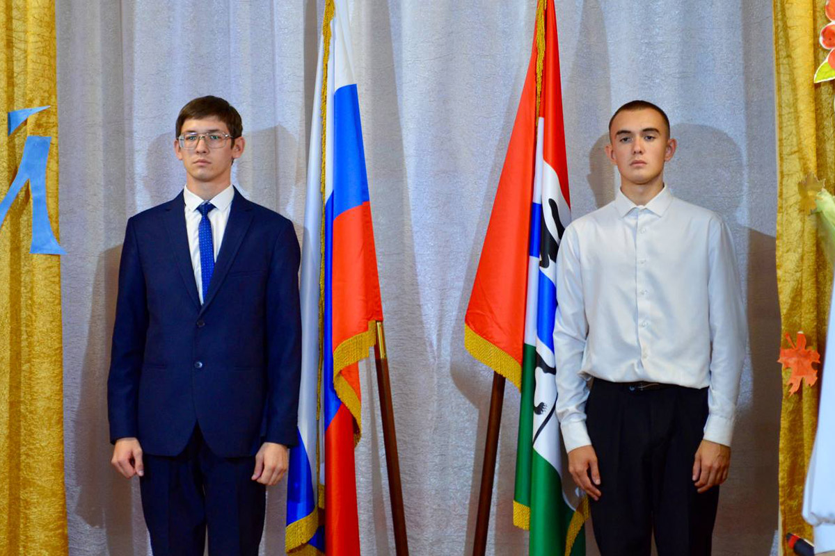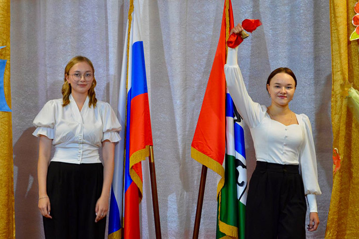 Линейка была официально открыта исполнением Государственного гимна Российской Федерации и церемонией выноса государственных символов. Право внести Государственный флаг Российской Федерации было предоставлено студенту 4-го курса специальности "Педагогика дополнительного образования" Алексею Закомалдину, а флаг Новосибирской области - студенту 3-го курса специальности "Сольное и хоровое народное пение" Вячеславу Шурышеву.