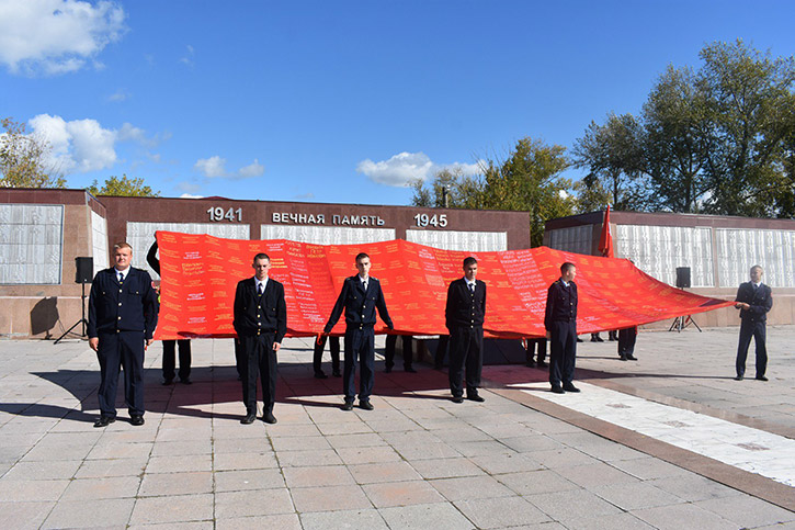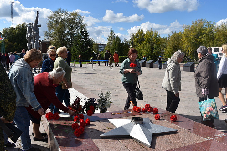 В память о павших на полях сражений барабинцев была объявлена минута молчания, в знак памяти и уважения к боевым и трудовым подвигам земляков в годы Великой Отечественной войны участники церемонии возложили цветы к вечному огню.
