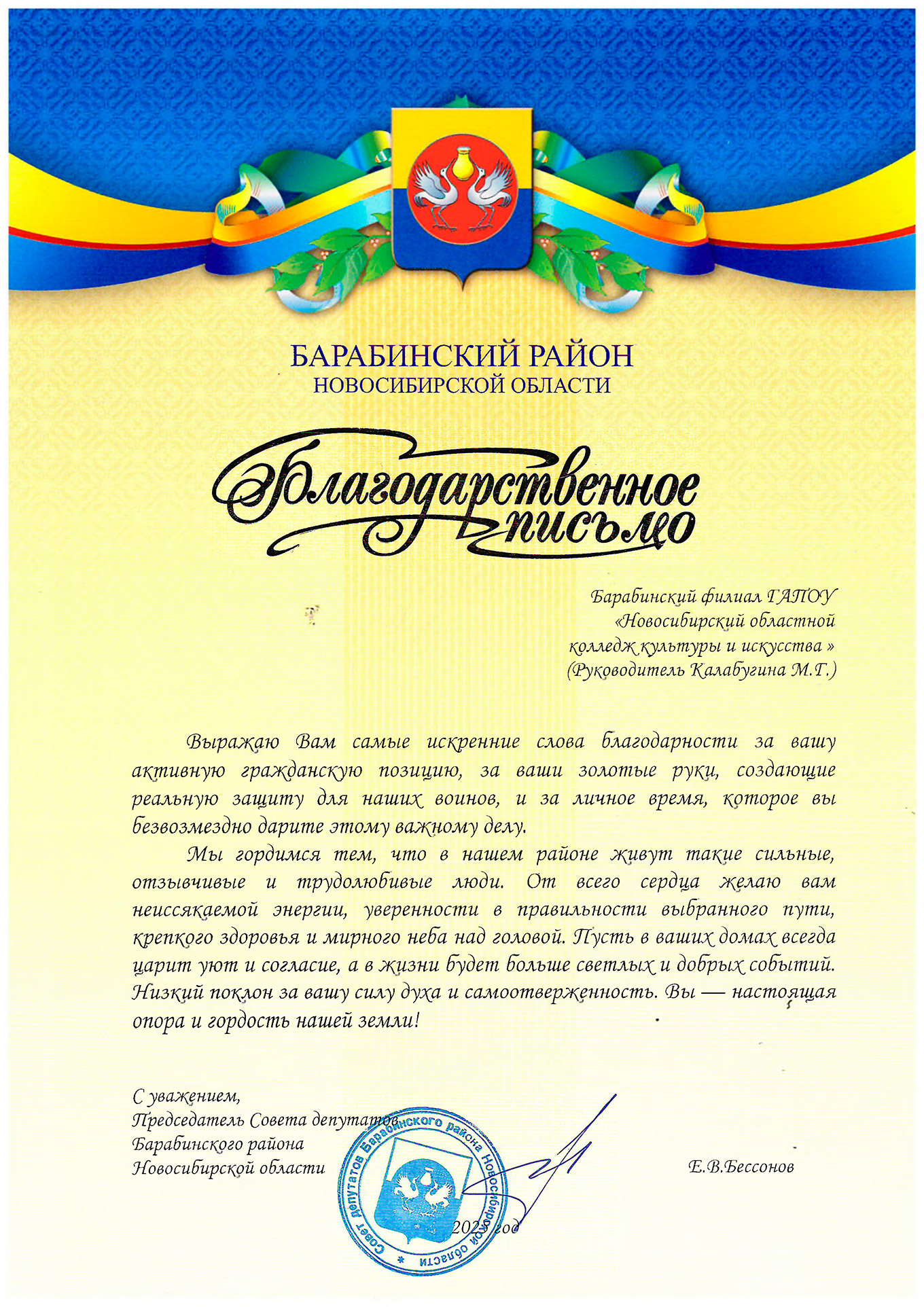 Заслуженной награды удостоен волонтерский отряд "Доброволец" колледжа культуры и искусств за активную гражданскую позицию, за золотые руки, создающие реальную защиту для воинов, и за личное время, которое безвозмездно волонтерский отряд дарит этому важному делу.