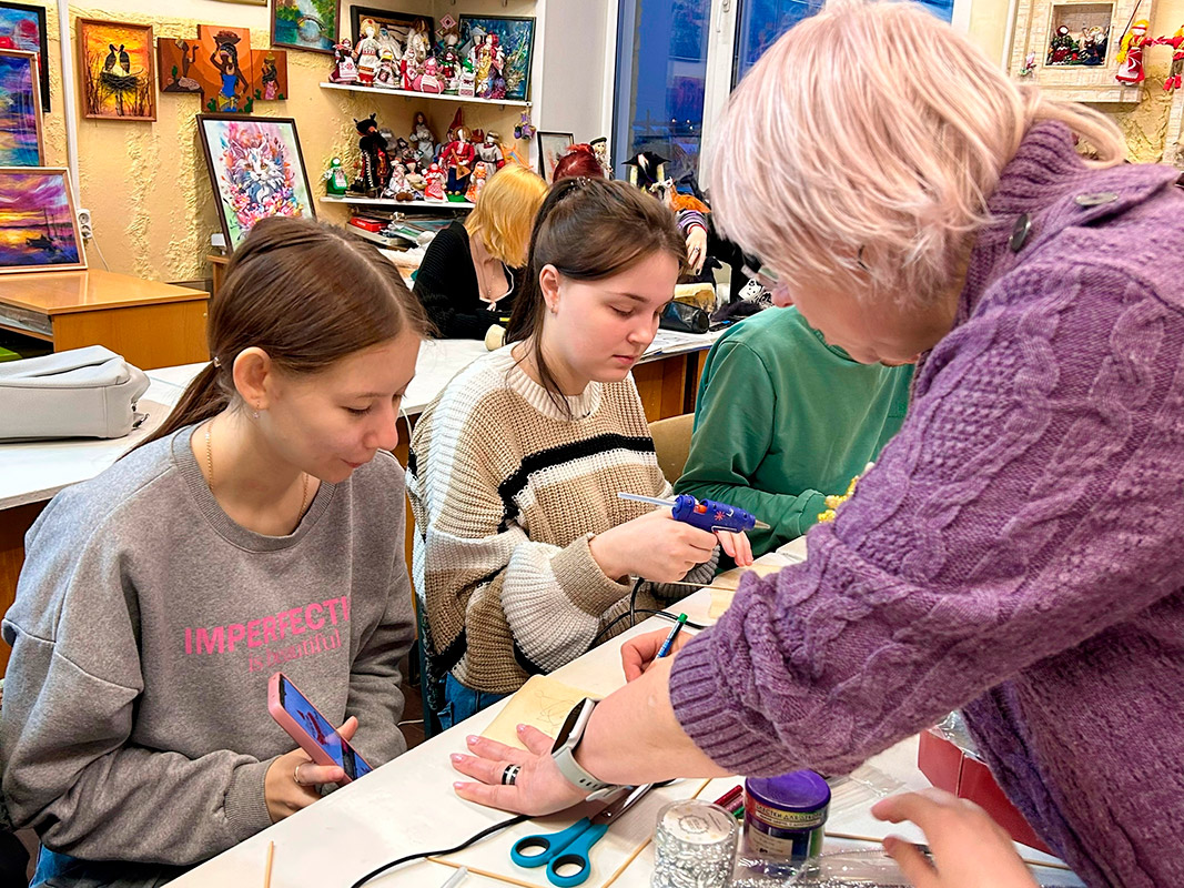 А самым увлекательным этапом стало декорирование получившихся силуэтов. Студенты активно использовали разнообразные блестящие материалы: мелкие бусины и яркие блестки, превращая свои работы в настоящие мерцающие символы праздника.