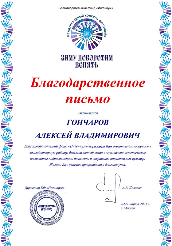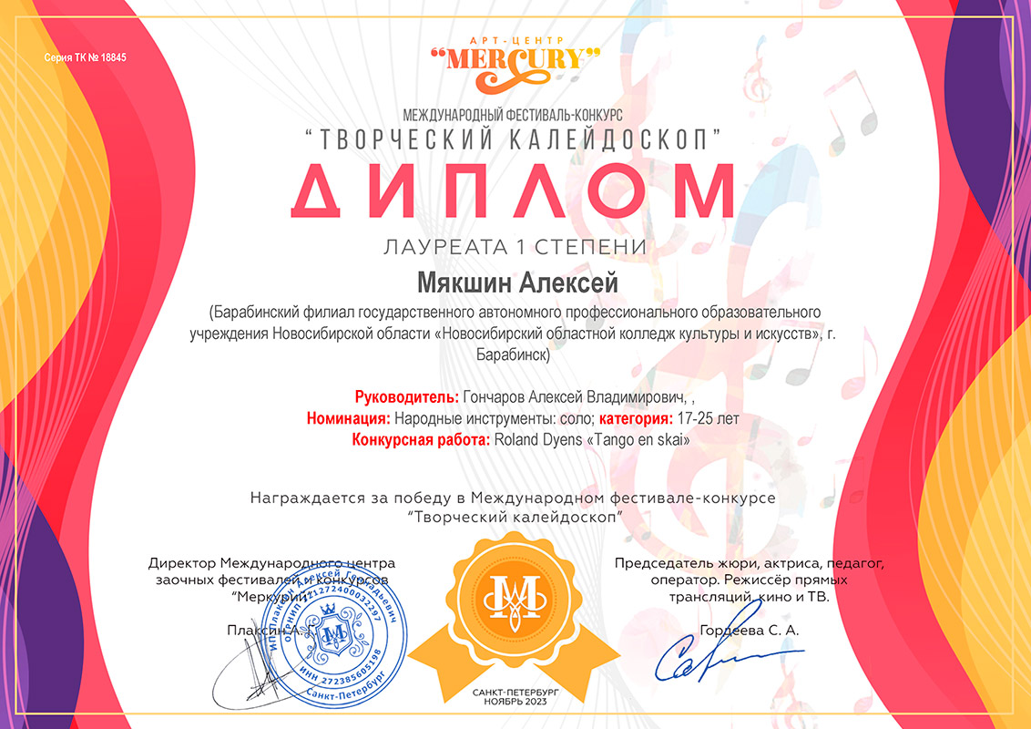 - звание лауреата I степени в международном конкурсе "Сибирь зажигает звёзды" в номинации "Инструментальный джаз",